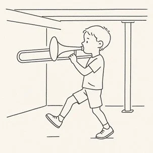 I loved that trombone! I would go to the basement and play it, just like the trombone players in the parade. No need to play notes like Frank did when he practiced. That didn’t sound very good. It sounded so much better just blowing into it and working the slide back and forth. I marched around the basement with my chest puffed out and shoulders back, alternating playing and singing. “Seventy-six trombones in the big parade…”